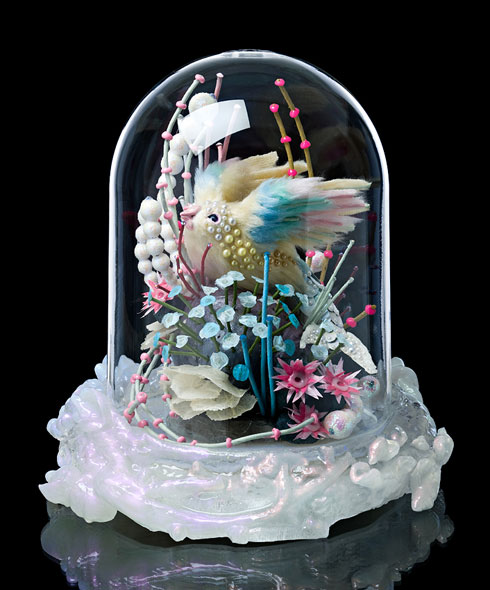 With a skillful use of synthetic materials, utilising everything from expanding foam to fake fur, hair, resin, jewels and glitter, Melbourne based artist Kate Rohde creates sculptures and installations that seem to come some hyper-colour, ’80s cartoon dreamland. Rohde’s extremely detailed installations, dioramas, taxidermy replicas and recreations of Baroque cabinets question and re-imagine notions of natural history. Rohde herself describes it perfectly as “natural history museum on acid”. And that’s exactly what her work is like… a trip to the museum turned a little bit freaky. With a unique humour and distinct imagination, Rohde forces us to flip the conditioned ways we categorise and compartmentalise to make sense of the natural world that surrounds us. Rohde’s aesthetic draws heavily from the Baroque and Rococo periods both in it’s intricacy and it’s garishness. Her skill in mashing up references makes for a weird result that is sort if like the Land Before Time meets 16th Century Cabinet of Curiosities. It’s so wrong it’s right.
